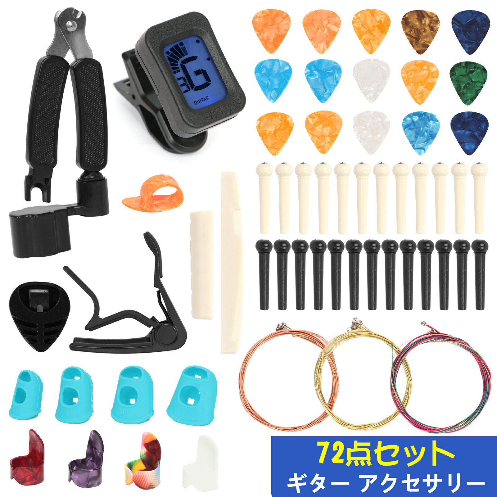 ■【レビュー特典付】ギター アクセサリー 初心者入門72点セット アコースティックギター用アクセサリー 小学生 大人用 ギター 初級セット 予備弦 チューナー 3in1弦交換器 交換用弦 気軽に入門練習をする 送料無料