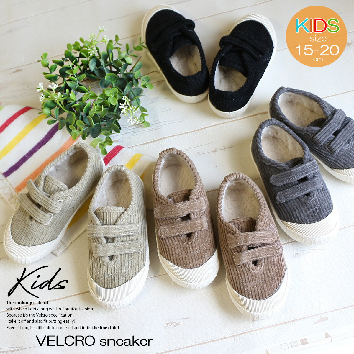 キーワード:ボア フラット カジュアル ブラック ブラウン 黒 茶色 小さいサイズ秋冬ファッションに相性の良いコーデュロイ素材のスニーカー内側全面ボアで寒い冬も足元あったか!マジックテープベルトで子供でも脱ぎ履きらくちん、歩きやすい!屈曲性のあるソールと安定性のある履き心地! ■ 商品詳細 靴タイプ 対応サイズ 採寸方法について詳しくはコチラ 【15.0cm】【16.0cm】【17.0cm】【18.0cm】【19.0cm】【20.0cm】 アイテムスペック サイズ 履き口 甲幅 底幅 筒丈 15.0cm - 13 6.4 - 16.0cm - 13.4 6.5 - 17.0cm - 14.0 6.8 - 18.0cm - 14.4 7.0 - 19.0cm - 15 7.2 - 20.0cm - 15.2 7.5 - ∗単位:cm ヒール高 ストーム高 1cm - 素材 片足重さ 合成皮革/コーデュロイ 約163g(計測サイズ:17.0cm) 機能性 マジックテープベルト仕様内側前面ボア 注意事項 入荷・製造時期によって色味が若干異なっていたり、同サイズでもサイズ感が異なる場合がございます。海外生産品につき、接着面の多少のノリ汚れやキズ等がある場合がございます。商品によっては染料および素材の性質上匂いが強いものもございます。より良い商品を販売できるよう検品の強化には努めさせて頂いておりますが、上記のような場合も御座いますので、ご理解下さいませ。
